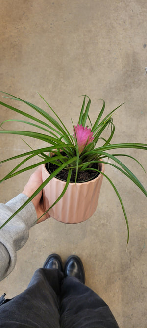 Étant une plante épiphyte, la Tillandsia n’a pas besoin d’être mise en terre pour survivre. Dans le cas ici de la Tillandsia cyanea, elle est cultivée en pot, car elle a un système racinaire bien développé et cela permet de mieux gérer son arrosage.
